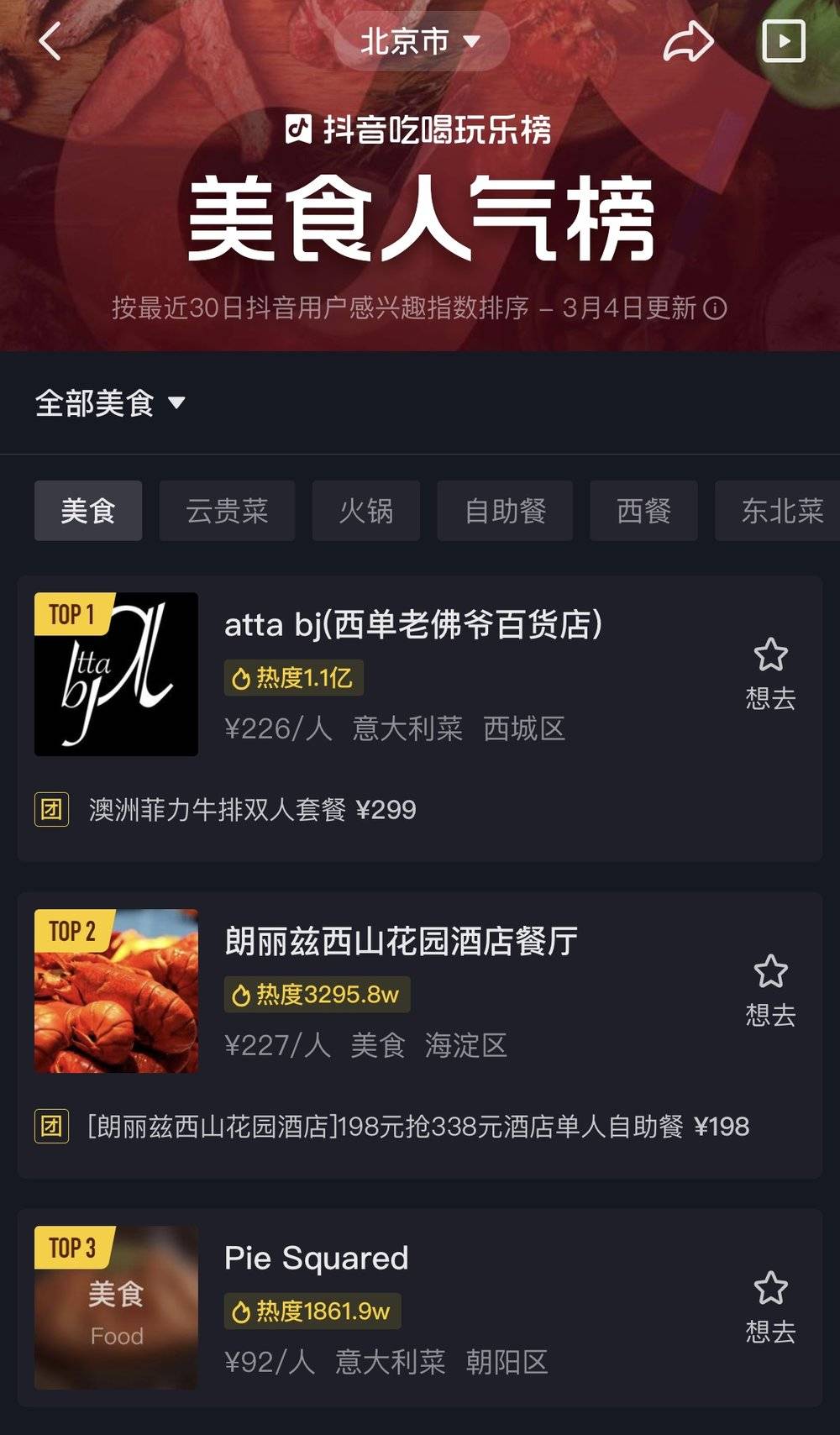 除本地餐饮商家的团购券,抖音团购的重要部分,一个按照最近30日用户感兴趣指数排序、类似于大众点评必吃榜的“抖音吃喝玩乐榜单”也已形成。