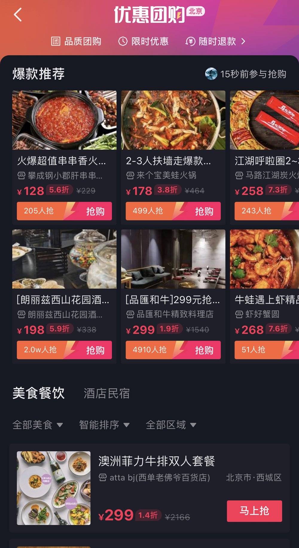随着定位功能越来越多地应用到具体场景中,抖音的本地生活服务也逐渐成型。 从榜单开始 目前,抖音团购的内容并不多,按照“美食餐饮”与“酒店民宿”仅有两大块。页面较为简洁,基本的排序选择体系相对完善,不论是按照菜系、区域还是折扣、价格划分,都有可选项。