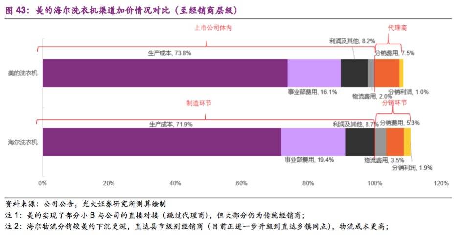 以海尔洗衣机为例,跟美的洗衣机相比,原本生产成本占有,但事业部费用、物流费用、分销环节费用都比美的高,导致最终价格高于美的。