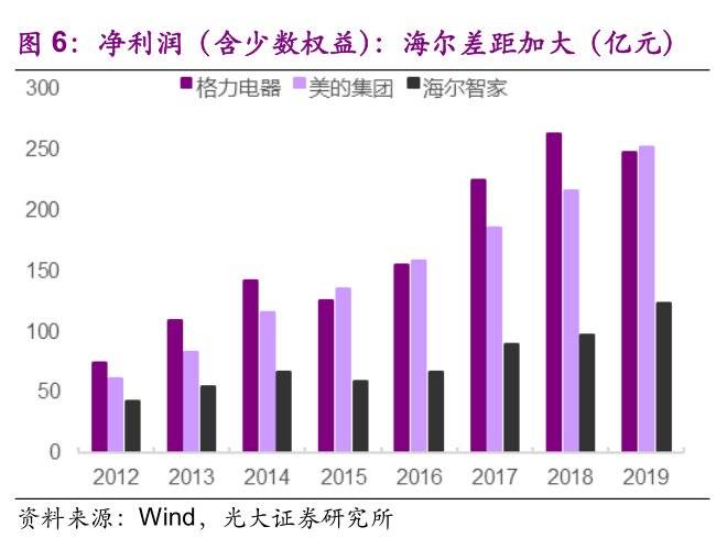 2019年,三大巨头的收入规模均已突破了2000亿,但海尔的净利润仅为123亿元,与格力的247亿元、美的的253亿元相比,落后了一半。
