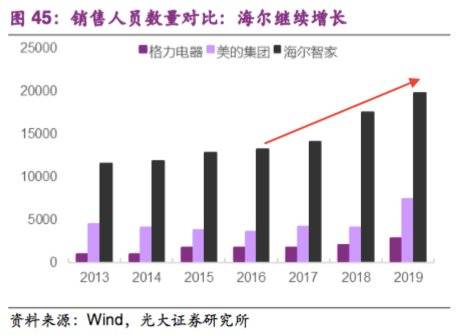 这种下沉程度也意味着,海尔要承担比美的、格力更高的物流、销售成本。在地级市的销售公司办事处,格力、美的通常只有4~6人规模,海尔的人数却可以达到15人。