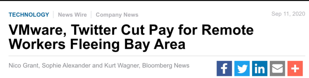 图片截自于Bloomberg VMware表示,此前在硅谷总部工作的员工,如果搬到丹佛等加州以外城市,就必须接受大约18%的减薪,而搬往洛杉矶或圣地亚哥等州内城市则减薪8%。Twitter的政策也非常类似。而为了缓解员工减薪情绪,Twitter还给予了远程员工一次性 1000 美元的在家工作补贴。 多数员工理解减薪,也有公司不跟风 对于选择远程办公就要接受减薪这个“鱼”和“熊掌”的选择题,美国职场匿名论坛Blind就在最近发起了一项调查,用以了解在员工眼中此项政策的合理性。 调查结果现实,约 59% 的受访科技工作者表示,如果员工搬到更便宜的地方,那科技公司减薪是可以理解的,只有 20% 的人表示根据地点来减薪是错误的。而在各个公司内部这项政策的支持比例则更高,70% 的 Facebook 员工、71% 的谷歌员工、62% 的亚马逊公司员工、而 63% 的微软员工都认为,以减薪来换取远程工作是合理的。 对于科技公司的员工来说,工资只是他们收入构成的一部分,只要股权收益不变,其实也很愿意用减薪换取在家自由工的时间。今年4月,Blind就做过一项名为“你是愿意每年多拿3万美元还是愿意在家工作”的调查,在来自45家大型公司3000多名科技从业者的投票中,有64%的员工选择了不要3万美元而在家工作。
