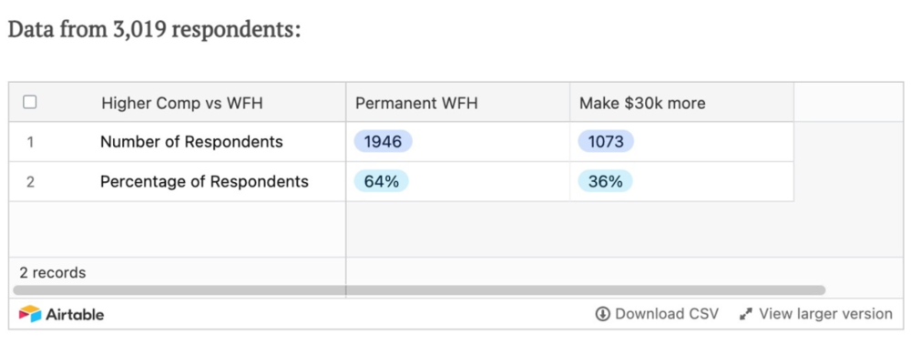 而这样的选择,在亚马逊、微软、谷歌、苹果、Facebook等巨头中都超过了受调查者的半数以上。可以看出,Google、Facebook目前这种选择灵活办公而适当降低薪酬的模式其实是有“群众基础”的。而这种减薪政策可能也会逐渐在更多的科技公司中进行推广。