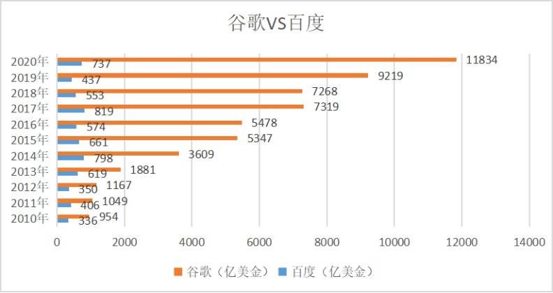 另外在亚马逊创始人贝佐斯旗下还有家非常知名的太空探索公司——蓝色起源,就是前不久新闻里大热的,完成其首次商业载人航空的那家。这家公司创办于2000年,贝佐斯一直在投入,其资金主要来源于贝佐斯不定期出售其名下亚马逊的股票。 小结3 阿里是互联网企业中走出国门走向全球化做的最好的企业。电商业务而言,亚马逊与阿里各自海外用户数能做到旗鼓相当,算上本土用户阿里的总用户数可能甚至超过亚马逊。但亚马逊的总营收能达到阿里的3倍,主要还是缘于欧美更高的购买价格。做海外电商的都知道,一件商品在国内,售卖到国外换算成人民币至少是3倍以上,有些小商品甚至要高达10倍以上。 曾经阿里的市值一度超越亚马逊,但如今市值已经只占后者3成左右。还有个重要原因是阿里主营核心电商业务,面临的激烈竞争远甚于亚马逊有关,如京东、拼多多都是强大的竞争对手。亚马逊的研发投入费用是阿里的5倍左右。 总结 以上三组的对比可以发现,过去10年美国的互联网巨头型企业的市值与营收,总体上将中国同行的差距拉的更大,尤其是百度最为明显。美国不仅基础更大更强,速度增长却更快,资本也更为雄厚,投入的研发资金规模普遍数倍于中国同行。 如果市值、营收及研发产出比可能受到“估值偏见”和汇率的影响,那么服务用户的规模则是不折不扣的硬指标,在这项上我们仍然是被拉开极大的差距,谷歌(Alphabet)集团服务的整体用户规模超过30亿,仅facebook月度活跃用户就达28亿,超过中国总人口,还在以两位数比例增长。 在上一个环节,对比中国美国互联网整体的发展情况,某些指标上如中美互联网人口增速及渗透率上,中国有一定优势或者追赶势头很猛,但如果把美国这些互联网头部企业,卷入的全球非美国人口也算进来,我们就被拉的差距更大。 由于中国互联网处于后发国家的地位以及意识形态的不利处境,我们国家有意识的在某些领域竖立了藩篱,这在一定程度上保护和壮大我们的互联网企业,例如百度搜索和腾讯社交网络,基本上没有遭遇国外同行的冲击。但事实的结果是,这些被保护起来的互联网巨头,却丧失了走出国门的雄心。 百度和腾讯在各自核心领域的全球化上几乎毫无成绩可言,这与美国互联网企业全球攻城略地形成鲜明反差。有人说是语言问题导致,但阿里这块是做的不差,同时美国互联网企业在各个国家和地区的发展也同样是以当地语言展开的,所以说语言其实并不是最大障碍,最好的例子是字节跳动旗下的Tiktok(抖音海外版)。 中国互联网界一直流传着一个疑问,如果放谷歌进入大陆市场,百度还能赢吗?这个问题,我觉得可以从一个侧面来回答,只需看谷歌浏览器在现今中国浏览器中的比值就知道了。百度搜索如今做的有多差,我在本文搜集国内信息时候体会最深,同样国内信息,谷歌搜索呈现的体验要好的多。 中国互联网头部企业要走出国门,在竞争中提升自己壮大自己,已经显得尤为迫切。走出国门获得成功,不仅是在全球化中获取利润,对于改善和构筑我们国家的优势也作用甚大。前文,所述中央财经工作会议指出“从构筑国家竞争新优势的战略高度出发”,相信已经看到这个问题。政府下一步是不是会鼓励互联网企业积极出海,让我们拭目以待。