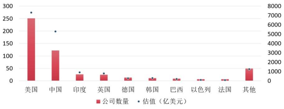独角兽的数量比较 除了整体规模、头部企业的比较外,我们还可以再看看独角兽企业的数量。独角兽是指市值规模超10亿美元但还没有上市的企业,独角兽代表的是最具成长性企业。