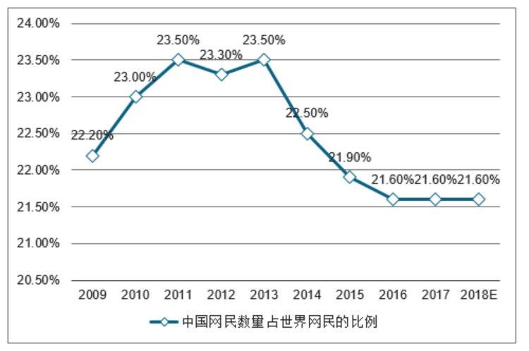 根据2021年1月初CB Insights的统计数据,全球拥有超500家独角兽企业,其中美国以255家位居首位,中国以122家位居第二。中美两国的独角兽来自各行业,但普遍互联网属性强烈,所以也非常好能用来作为讨论中美数字经济发展的参考。2020年的新晋独角兽中,68家来自美国,占到了62%,中国仅有9家在2020年入围独角兽榜单。 从独角兽数量情况来看,中美依然是未来全球互联网最重量级的top2玩家,但中国互联网企业未来追赶美国依然任重而道远。 中国互联网的十字路口 处在追赶的关键时刻,但中国互联网的问题已经开始暴露出来,在我看来主要有以下几点: 中国互联网正在接近增长的极限,迫切需要走向全球化 中国互联网主要受益于中国市场,美国互联网则覆盖全球市场。随着中国互联网人群的规模和增长接近极值,未来几年几乎所有的头部型互联网企业都会面临用户增长放缓的瓶颈。 下图为智研咨询的数据,中国网民占世界网民的比例,可以看到在逐渐下降,说明世界总体互联网人群在加速入网。