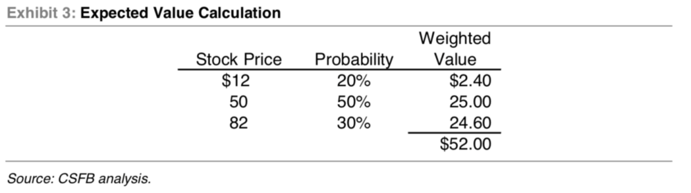 风险的经典定义是遭受伤害或损失的概率。因此,具有较宽的潜在回报分布区间的资产比那些具有较窄的潜在回报分布区间的资产“遭受损失或大额获利”的概率更大。我们同意彼得·伯尔斯坦的观点,他指出“波动性或方差,具有直观的吸引力以作为风险的风向标。” 他补充道,“如果你被要求对巴西基金的股票的风险进行排列,通用电气股票、三十年到期的美国国债、以及在九十天到期的美国短期国库券,他们三者的排名是显而易见的。证券的相对波动性也是如此。” 关键在于波动性的时间维度。更直接来说,有一些证据表明,方差低估了持有期前四年的风险,但夸大了在持有期四年后的风险。这意味着长期投资者比短期投资者预设了更少的风险。我们甚至可以发表声明:长期投资者在有助于呈现投资机会的情况下乐于看到更多的波动性。 我们希望至少在两个层面上去思考风险。在短期内,波动性是一种非常合理的风险衡量指标。实际上,波动性在衍生品的设计和估值(主要是期权)起到了压倒性重要的作用。 但对于长期投资者来说,我们认为平衡风险和收益最好的方式是买入那些具有安全边际的股票。我们认为这正是当巴菲特思考风险时所认可的观点。安全边际这一概念由本·格雷厄姆提出,存在于当你用明显低于股票内在价值的价格买入一只股票。巴菲特明确地定义了什么是内在价值:一家公司剩余生命周期内可以产生地现金的折现价值。 二、安全边际 我们认为重述安全边际这一概念的最佳也是最实用的方法是去思考预期价值的折现值。不同潜在结果和它们各自的概率的组合决定了预期价值。巴菲特说,“权衡损失的概率乘以可能损失的金额,以及收益的概率乘以可能收益的金额。这是我们正在尝试做的事情,虽然它并不完美,但这就是安全边际的全部含义了。” 让我们用投掷硬币来举个简单的例子,当硬币为正面时将获得3美元、硬币为反面时将获得1美元。它的期望价值是多少?你可以用(50% x 3)+(50% x 1)= 2 计算出来。对于投资来说,潜在结果的多样性和概率是更加难以预测的,但它们的内在理念是一样的。让我们更进一步来观察概率和潜在的结果。 我们可以将概率氛围:客观(或频率)和主观。当有指定的结果时,就会出现客观或频率概率。掷硬币就是一个很好的例子。在这些例子中,概率是基于平均的法则因为它假设了这一事件将重复无数次。当我们仍然无法对任何特定结果做出定论,这些结果的发生频率反映出了每一种结果的可能性大小。 对于只发生一次的事件——股票投资的有效假设来说,情况则完全不同。在这里,我们必须依靠主观概率。主观概率代表的是投资者对结果的“信念程度”。这些概率很少是静态的,通常会随着不同事件的出现而变化。贝叶斯定理是一种基于新信息不断更新条件概率的方法。当只有一种结果会发生时,贝叶斯分析是一种权衡多种可能结果的有效方法。 正如罗伯特·哈格斯特罗姆所指出的,贝叶斯分析的教科书表明,如果你相信你的假设是合理的,就可以完全可以接受你假设的特定事件的主观概率等于频率概率。用概率的方式去思考投资世界对于安全边际概念来说至关重要。 我们现在转向潜在的结果。分析师经常使用目标价格来代表他们对最有可能发生的结果的最佳猜测。然而,聪明的投资者明确承认他们必须考虑一系列潜在的结果。那么投资者如何构建这个范围呢? 预期投资方法提供了一个基于对预期的各种修正的计算潜在结果的特定过程。简而言之,该过程考虑了销售收入、运营成本或投资的变化是否对股东价值的影响最大。(这一步骤明确考虑了交互性,例如,较高的销售额有时也会提高运营利润率。)一旦你为最重要的触发因素制定了合理的范围,你就可以确定由此产生的股东价值的范围。 例如,我们假设你认为销售额的增长速度对某家公司来说是最重要的触发因素。然后,你便可以考虑销售额引发的所有微观经济因素(例如,经营杠杆、规模经济)并估计由此产生的以计算为导向的价值驱动因素。这可以让我们估计股票价格结果。 我们通常建议至少考虑三种结果:一个是高价值、一个是低价值、一个是共识下的价值。共识价值代表的是当前股价所反映的预期。这些结果,当与各种相互联系的概率结合时,可以为我们提供预测期望价值的坚实的基础。 设想一个简单的例子。假设对一只股票的潜在结果包括:82美元的高价值和12美元的低价值。该股票目前的交易价格为50美元。接下来,我们假设这三种结果的主观概率如下:低价值的概率为20%,高价值的概率为 30%,共识价值的概率为50%。那么,该股票的预期价值应该为52美元,如图3所示。