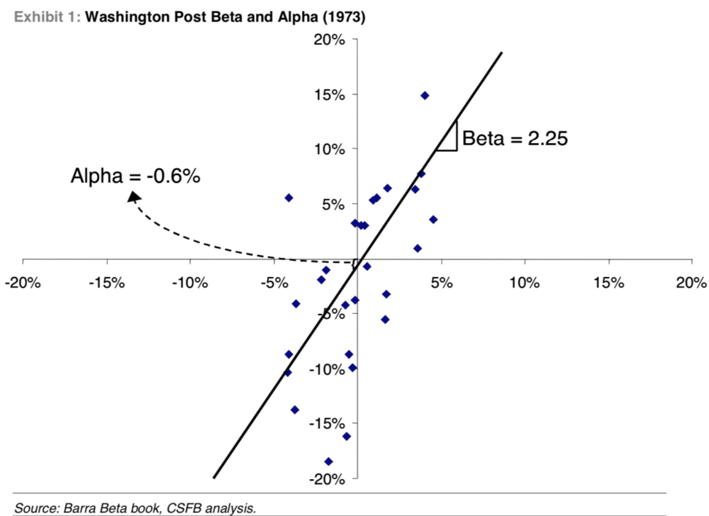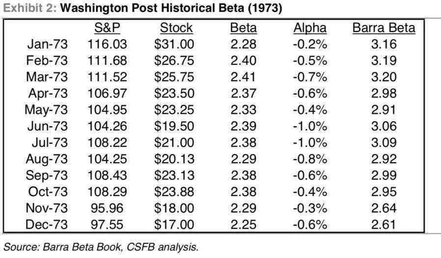 我们爱沃伦·巴菲特。如果你们曾经读过我们的研究报告或者听过我们访谈就知道我们没撒谎。但是,有些东西困扰了我们很长一段时间,我们必须要说出来。 巴菲特在这件事上是错的。 通常,当巴菲特需要引入金融理论时,他会讲述上述故事作为他案例的初步证据。1970年代初,华盛顿邮报的股票遭受重创,贝塔系数上升(表明该股票的风险更大),而任何思想正确的投资者都应该看到该股票实际上风险更小(因为价格下跌超过了其应有的价值)。 巴菲特的论据有两个问题。第一,这只股票的贝塔系数并没有上升:我们有实验数据来支撑。第二,巴菲特认为该股票风险性降低是在其假设价格与价值的差距扩大的前提下——该股票的“安全边际”增大。但是,只有当巴菲特所相信的与市场共识不同时,价值才能在逻辑上与价格区分开来。事实证明,巴菲特的判断是正确的,但这并不一定能证明金融理论的缺陷。 巴菲特的忠实粉丝们请放心,这份报告会有一个开心的收尾。事实上,我们相信所有投资者都可以通过学习和实践巴菲特的选股方法,学到很多正确的投资理念。但在我们了解好东西之前,我们必须解决关于贝塔系数的问题。 我们不是金融理论信仰的热心捍卫者。事实上,我们已经讨论过,一个基于复杂自适应系统的新框架将取代现代金融理论。但它是一种完全不同的理论和游戏,用一种过于钻牛角的方式去挑战金融理论。 金融理论也没有说华盛顿邮报股票的贝塔系数一定会因为股票下跌而上涨。这种说法混淆了贝塔系数(一种衡量股票相对于市场、通常使用标准普尔500指数的协方差的指标)和阿尔法系数(一种衡量风险调整后超额收益的指标)。 图一展示了华盛顿邮报的贝塔系数和阿尔法系数。贝塔系数是这条线的斜率,即华盛顿邮报的月收益率除以标普500的月收益率。贝塔系数不衡量一个资产相比于另一资产的收益率,它只衡量一个资产的价格弹性是否大于或小于另一资产。 阿尔法系数,是这条线的截距,代表的是价格的变化率。所以,尽管华盛顿邮报在1973年的阿尔法系数是负的(即它的收益要低于市场上的同类公司),但并不意味着它的贝塔系数就一定要上升。
