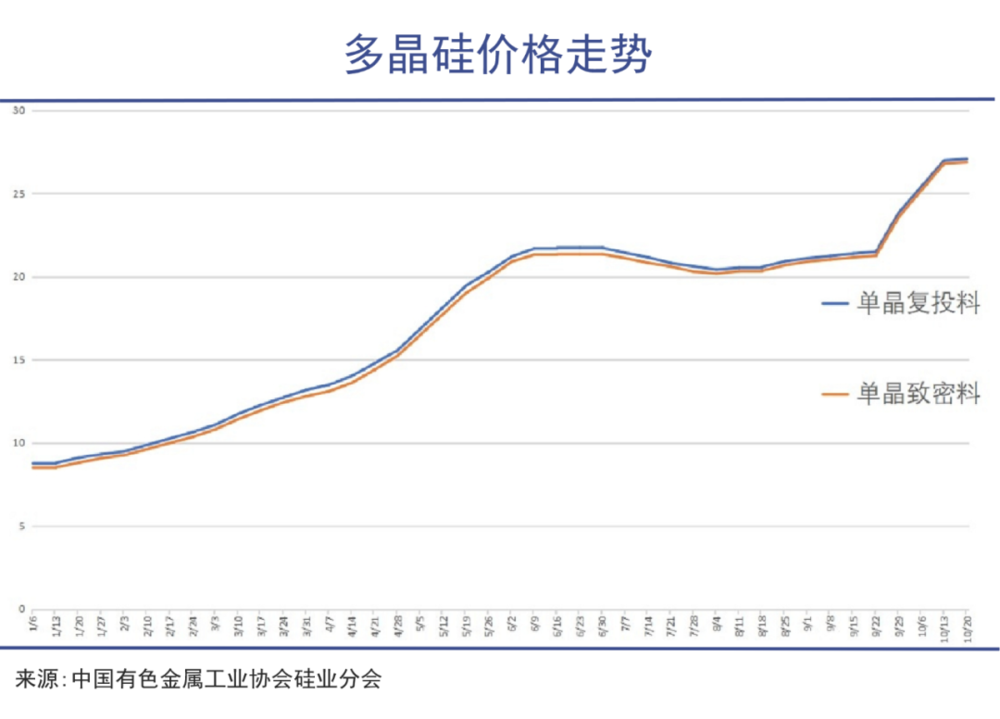 “别让硅料烫伤了整个光伏行业”。去年业内人士对于硅料涨价的呼吁言犹在耳,但却没能阻挡住今年硅料价格的继续飙升。 今年以来,硅料曾迎来短暂的小幅降价阶段,但在8月份之后开始反弹。 10月20日,中国有色金属工业协会硅业分会公布的最新硅料价格显示,本周国内单晶致密料价格区间在26.0~27.3万元/吨,成交均价为26.87万元/吨。这个数字相比年初不足8万元一吨增长超过3倍,且保持在近十年的价格高点上。