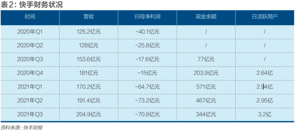 即便是快跑,单纯的烧钱换增长思路,也已经不能支撑快手的下一步了。本文来自微信公众号:财经十一人(ID:caijingEleven),作者:刘以秦、郑可书,编辑:谢丽容,本文首发于2021年12月6日,头图来自:视觉中国(图为山西榆林:道情戏演员快手直播演出现场) 中国两大短视频平台抖音和快手,一直以来发展风格差异明显,相比抖音的激进,快手的风格是慢。 在抖音上,用户会明显感受到,一条视频火了之后,会在短时间内出现大量类似的内容;而快手上很难找到大量类似的视频内容——这背后是算法的作用,也是快手的慢导向的体现。 快手是短视频领域的开创者,抢占了市场先机。被竞争对手抖音超过,只用了不到半年的时间,2018年春节期间,抖音日活跃用户数7000万,而当时快手日活已经破亿;几个月后,2018年6月,抖音以1.5亿日活反超快手。抖音在高速扩张时,快手的增长只能用平稳来形容。 最新的数字是,抖音的日活跃用户已经超过6亿人,快手日活用户达到3.2亿。 如果说这些都是慢的体现,快手在资本市场上的表现,就不能单纯用慢来解释了。从2021年中开始,快手股价持续下跌。2021年2月,快手在港股上市后,市值一度达到1.5万亿港元(约2000亿美元)的最高点。8月20日,快手股价跌至历史最低点每股64.5港元,跌幅达到83%,市值蒸发超过1万亿港元。 股价大跌的一部分原因,是政策和市场环境的影响,但资本市场对快手的担忧还来自它自身。一位投资人告诉《财经》记者,快手最大的问题是经营情况不及预期。一些投资人认为快手可以通过烧钱,缩小与抖音的差距,所以前期给了快手很高的估值,但事实证明目前很难做到。 这样的背景下,快手烧钱的速度和规模让投资人焦灼。2017年~2019年间,快手每年盈利在2亿元~10亿元,2020年,快手亏损79亿元,2021年前三季度,快手共亏损145亿元。每年100亿元上下的亏损规模,相当于亏掉一个中国中大型企业一年的营收。