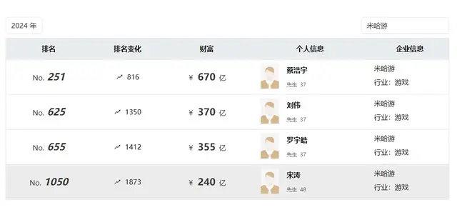 金钱永不眠!一家成立仅10余年以自研游戏为主的公司,还没上市却提前上演了造富神话,一下干出了四位百亿富豪! 它就是仅次于腾讯、网易的游戏独角兽——米哈游。 ![]() 图源:文心一言 01 日前,胡润百富《2024家大业大酒·胡润全球富豪榜》发布,蔡浩宇、刘伟、罗宇皓、宋涛四位米哈游骨干以670亿、370亿、355亿、240亿的身家齐齐登榜,超越了诸多前辈(四人合计身价已达1635亿元)。 更有意思的是,他们的排名较去年分别蹭蹭上升了816名、1350名、1412名、1873名,简直就是坐上了“印钞火箭”! ![]() 图源:胡润百富 早年有人在知乎上提问:该不该把兴趣当做事业? 一高赞回答表示:“本喵就是把兴趣当做事业,感觉十分happy。作为一个可以把喜欢的事情,做的很好,不喜欢的事情,半点不想做的人,只有这个选择是有解的吧。唯一的坏处就是,休息时间比较无聊,还不如去上班!” 这个实名回答者,就是米哈游第一人——蔡浩宇。 ![]() 另外两名元老级创始人刘伟和罗宇皓,是蔡浩宇研究生时期的室友,而第四人宋涛则是在米哈游资金紧张时送来100万资金援助,这100万到现在足足涨了近2万倍,一本万利不过如此! 从技术宅男到现象级游戏《原神》的问世,再到如今“一榜四位富豪”,天选之子米哈游到底是如何炼成的?值得探究一番。 02 游戏行业素来常出富豪,《2024胡润全球富豪榜》中,腾讯马化腾、网易丁磊的个人财富达2500亿、2100亿,排名位列中国第3名、第5名。 但要论增幅,他们都比不过37岁的米哈游的创始人蔡浩宇,他的个人财富估值比去年多了450亿,同比增长高达210%,是名副其实的中国“增幅最大富豪”TOP 1。 ![]() 图源:胡润百富 茨威格说:一个人生命中的最大幸运,莫过于在他的人生中途,即在他年富力强时发现了自己的人生使命。蔡浩宇就是这样的幸运儿。 蔡浩宇,1987年出生于山东济南的一个书香门第的家庭中,生活富足,教育得当。 5岁时,蔡浩宇就在计算机方面展现出极高的天赋,8岁时凭借一款独立制作的动画《外星使者》,获得全国计算机比赛二等奖,11岁时当选首批中国少年科学院“小院士”,后因物理竞赛被保送至上海交通大学计算机系。 研究生时期,蔡浩宇又凭借游戏《婆娑物语》,斩获大赛一等奖,拿到3万元奖金。也是在这一时期,他萌生了开公司的念头。 蔡浩宇拉上寝室同样喜欢ACG的刘伟、罗宇皓,在上海交大闵行校区D32宿舍内正式成立了小作坊——米哈游工作室。 ![]() 罗宇皓(左一);蔡浩宇(左二);刘伟(右二) 这个籍籍无名的小团队,第一桶金怎么来的?这得从2011年底的一次比赛说起。 03 “各位评委老师,各位现场的创业前辈你们好。我是来自上海交通大学米哈游创业团队的刘伟。” 彼时24岁还很腼腆羞涩的刘伟,带着米哈游萌系休闲游戏登上2011新新创业达人总决赛,台下的评委和观众哄堂大笑,对于“宅男”这个词,他们显然不甚了解。 ![]() 曾经投过4399和美图的著名投资人蔡文胜调侃:你今天最成功的就是向我们解释了什么是宅男。 米哈游围绕“宅男”打造“虚拟偶像”的思路太过于超前,以至于最后没有任何一家投资机构向米哈游抛去橄榄枝,好在他们获得了创业基金会提供的十万元无息贷款。 拿着这宝贵的10万元,米哈游维持了最早期的公司运营。三人工资4000块,合租在上海一间70平米的房子里,吃着楼下的菜饭骨头汤、兰州拉面、沙县小吃,喊出了一个响亮的口号:技术宅改变世界。 但10万块贷款很快花完了,米哈游团队一度面临融资无门濒临倒闭的境地,蔡浩宇只能四处筹钱。 优秀的团队从不缺贵人,救星出现了!时任斯凯网络CEO的宋涛给了蔡浩宇团队100万元天使投资,换取米哈游15%的股权,这也是米哈游迄今为止的唯一一笔融资。 斯凯网络原本是做塞班系统游戏的,IOS与安卓系统崛起后,公司不得不找新机会。“捡漏”米哈游可以说为宋涛的身价增长助力不少。 创业的前三年,米哈游开发的两款游戏《Fly Me 2 the Moon》和《崩坏》都反响平平。 直到2014年,国产动漫爆发,智能手机发展迎来“黄金年代”,《崩坏2》一经上线直接赶上风口,米哈游这才终于看到了翻身的希望。 2016年9月,米哈游又再度推出3D动作手游《崩坏3》,不到一年便拿到超10亿元营收。凭借崩坏系列,米哈游初尝走红滋味。 但是,由于过度依赖单一IP,资本市场对公司未来持续盈利的能力无法预估,这也导致米哈游在2017、2018年接连IPO被阻。之后,米哈游的上市计划便没有了新的进度。 米哈游开始考虑下一个“有跨越式品质提升”的新产品,前期研发就投入了一亿美元,这对于初出茅庐的米哈游来说无疑是一场豪赌。 04 从2017年6月到2019年6月,米哈游一直在闭门制作,联合创始人刘伟曾在接受参访时说,“我们大大低估了开放世界的制作难度”。整个项目的开发过程从“痛苦”到“失控”,刘伟说,“陷入泥潭,完全超出预期。” 真正的转折发生在2020年,《原神》横空出世。 这款产品的爆火如何形容呢?发行第一个月,就拿下了10月全球移动游戏的销量榜首,上线半年,仅苹果移动端收入就超过30亿美元,此后创下的纪录数不胜数:一年狂揽260亿、全球玩家破亿、海外营收占一半,还有传闻腾讯和字节跳动相继向米哈游抛出橄榄枝,结果“送钱”失败,后者始终没松口...... 不仅入股此公司难,想挖走米哈游的员工也难。 米哈游在薪资上出手大方。初创时,它就敢开两倍薪资挖人,现在为
