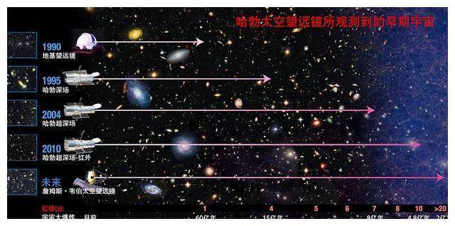 这些图片都是出自哈勃望远镜 图片来自:NASA 2012 年,NASA 发布了哈勃极深空的图片,这篇图片包含前十年哈勃空间望远镜的影像,在经过进一步处理后,哈勃望远镜拍摄到了 132 亿年前的星系,这片影像总曝光时长达到 200 万秒,相当于对着一个区域拍摄了 23 天。其中最暗的星系,光度甚至只有肉眼可分辨光度下线的 1/10000000000(一百亿分之一),这也是人类第一次看到宇宙初生时期的情景。