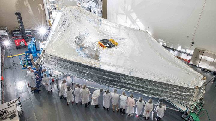 它采用了蜂巢式拼接镜面的设计,镀金的反射镜口径达到了 6.5 米,焦距达 131.4 米,反光镜面积是哈勃望远镜的 5 倍以上。我们知道,红外线对于温度非常敏感,为了保证红外探测设备的正常运行,詹姆斯·韦伯太空望远镜的反射镜和相机系统必须工作在 50K 以下的温度。 太空中可没有大气层遮阳,所以 NASA 为望远镜设计了五层展开后面积达到 300 平米左右的遮阳伞,这些伞重叠在一起,足以让镜片温度从 350K 下降到 50K。这些遮阳伞不但面积要大,重量还要轻。为了减少火箭的负担,每层遮阳伞的厚度仅有 25 微米(第一层为 50 微米),差不多只有两根头发宽。在发射过程中,5 层遮阳伞还要折叠起来,并在太空中自行展开。仅此一项,就可见其中技术到底有多复杂。
