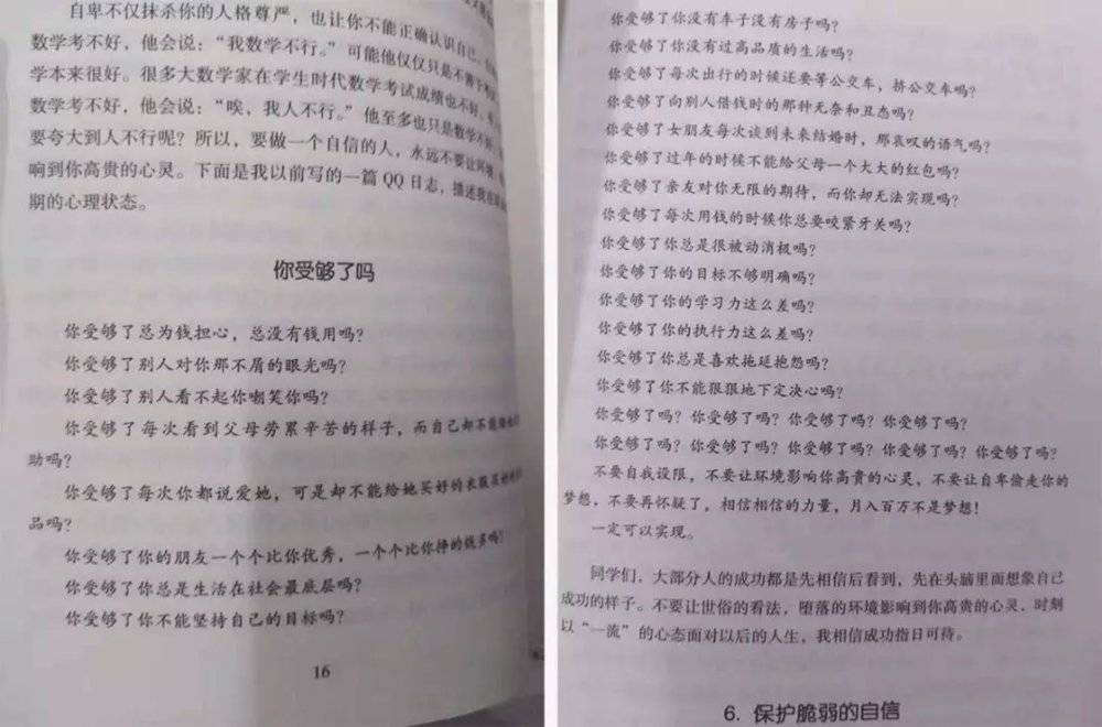 那些不哭的孩子不仅会在泪水环伺的感恩现场陷入格格不入的尴尬,还会遭到远处人群中班导的眼神鄙视。 不哭怎么会是好孩子? 虽然很多人到最后也忘了自己为啥哭了。但时隔多年,回想起那段泪腺尚且饱满的青葱岁月,还是会记得演讲结束后,被那本晒着演讲人和各种明星合照的书骗走的生活费。 演讲的最后总是会成为一场销书会,但在经历过这么一场精神上的饕餮盛宴后,台上那位“德育圣人”,合理地恰恰饭,也就不会被认为是多大的坏事了。 一颗感恩的心值多少钱? 凤凰网曾对一个感恩教育讲师团进行过调查。 通常一个地方要有几所学校都有需求,团队才会进行感恩教育演讲,如果只有一所学校,那么卖书时很可能会遇上购买力不足的情况。 他们会通过熟人介绍进入校园,如果书卖的好的话,学校也能拿一部分的提成。 既对学生们进行了感恩教育,又能调剂紧张的课余生活,书卖的好的学校还能有利润拿。于情于理,于公于私都没有不欢迎的理由呀。 于是,在相当长的一段时间里,感恩教育演讲风靡各大中小学校。即使部分学校拒绝了来校演讲的申请,但你永远也不知道这些手眼通天的商业机构能有怎样的人脉。 据说,一场中等规模的演讲通常能卖掉两车的书,全场一半以上观众会购买。 这些卖出的书通常极富辨识度。 除了直言不讳的书名生怕别人不知道这本书的寓意,封面之上通常都会用大大的红色圈出“感恩”二字,孝与德是贯穿全书的核心,感叹和问号是通篇内容的注脚。