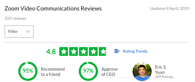 袁征 虽然这是一家硅谷公司,但其创始人袁征是一位华人,早年在中国长大、读书,后来赴美国创业。他就读于山东科技大学,读的是应用数学,很早就抱定了要去美国的想法。袁征在接受彭博社采访时提到,自己当年申请美国签证时曾被拒绝8次,第9次才成功成为移民。对于申请签证这件事,其实自己已经计划(plan)了二三十次。 他于1997年赴美后于视象技术公司WebEx工作。2007年,WebEx被思科收购后,他成为了思科工程副总裁。再往后,袁征于2011年从思科离职后创办了Zoom——他还从思科带走了40个工程师和自己一起创业。 盈利靠员工,主要是中国码农 给袁征颁发“最佳CEO”奖项的是美国职场版的大众点评Glassdoor,这个奖也是由雇员们评选出来的。雇员可以在上面匿名分享自己对公司的感受,包括工作环境、薪资等等。面试者可以分享自己的面试经验,使公司的招聘流程变得更透明。袁征和他的公司在这个网站上的评分达到4.8(满分5.0),有95%的人表示“会推荐给朋友”,有97%的人表示了对CEO的支持。