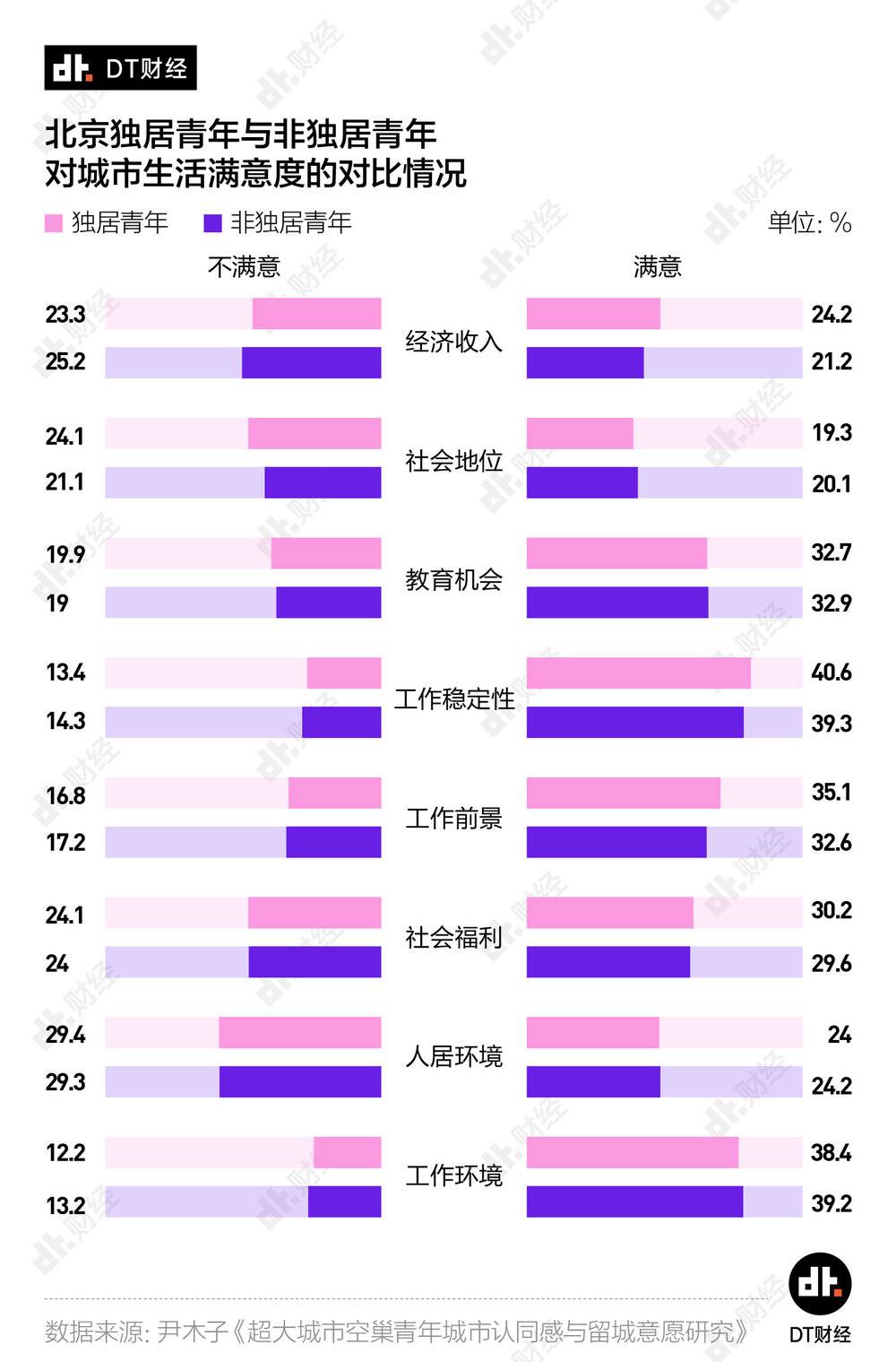 一项在北京开展的研究发现,城市里的独居青年相对于非独居青年,不管是在经济收入、工作稳定性还是工作前景上,都有着更高的满意度。大城市丰富的工作机会和高收入,成为独居青年自由选择的底气,也成为他们顶着巨大的住房压力,仍然大量流动至一二线城市的原因。 但是同时,独居青年对于自己能够在大城市获得的社会地位、良好的居住环境,所表现出来的态度并不够乐观。24.1%的独居青年对于在大城市的社会地位表达了不满意的情绪,较非独居青年高出3个百分点。 现实生活中,由于缺乏稳定的伴侣和家庭关系,即便是主动选择独居的年轻人,也在城市生活中常常感到归属感和认同感的缺失。