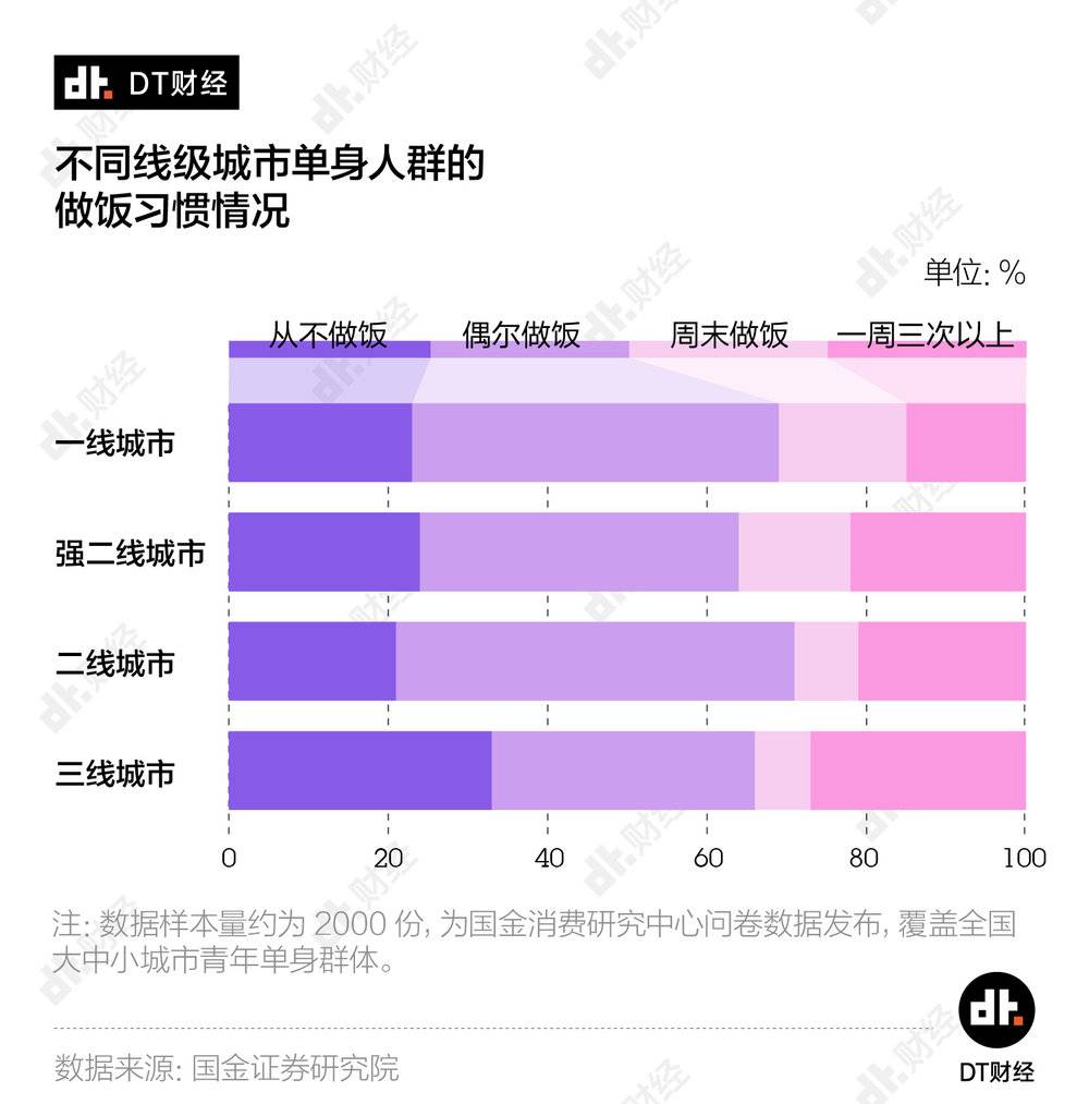 (图片说明:年轻艺人许魏洲在独居生活观察综艺中,展现了自己一个人在家多靠外卖解决吃饭问题的一面。图片来源:《让生活好看》) 在各线级城市,独居青年们偶尔做饭和从不做饭的比例加在一起都在6成到7成之间。尽管在疫情期间,我们观赏到了年轻人的花式下厨大赛,但回到日常生活中,年轻人尤其是独居群体,更多将厨房视为供奉生活仪式感的场所。考虑到做饭耗费的时间精力,他们更愿意为外卖买单。