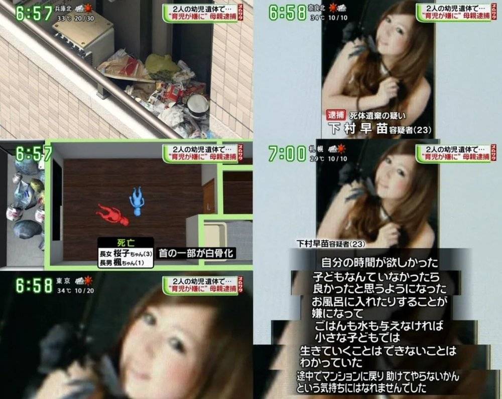 △ 梯沙希和女儿生前合照 不敢想象,这个大眼睛的可爱小女孩在妈妈不在家的8天里经历了什么,不管怎样哭喊也得不到回应,饿得奄奄一息逐渐没了声息,在臭烘烘的屎尿中永远闭上了眼睛。 据统计,截至2017年的15年里,日本有1175名儿童被虐待死亡。即便新闻上了热搜,但日本网友也见怪不怪了,评论里都是骂“鬼母,为男人着迷”之类的话。 1. 她将孩子锁在家中50天,惨剧一次又一次发生 这种惨剧在日本并不是第一次发生,媒体曝光、专家呼吁、网友谴责,怎么看都像是形成了套路。 在十年前的2010年6月,大阪市23岁的单身母亲下村早苗将3岁的女儿和1岁半的儿子锁在家中50多天,自己出去旅游。