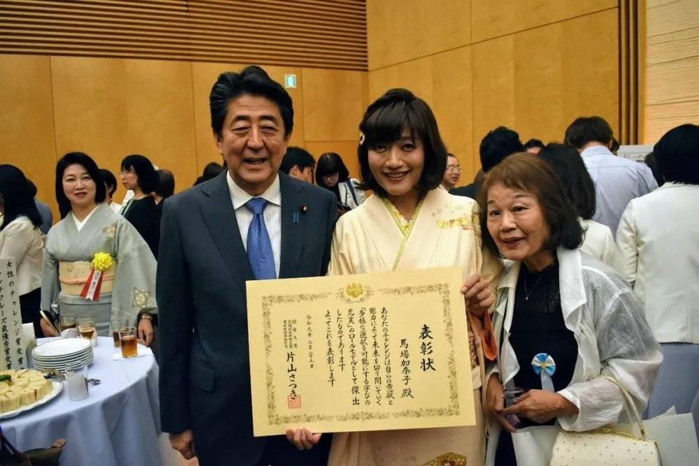 △ 马场加奈子获得安倍首相的嘉奖 她在离婚后卖过保险,后来从女儿的校服上发现了商机,创立了回收贩卖二手校服的公司,至今已在日本开了42家分店,为许多单身母亲提供了工作岗位。