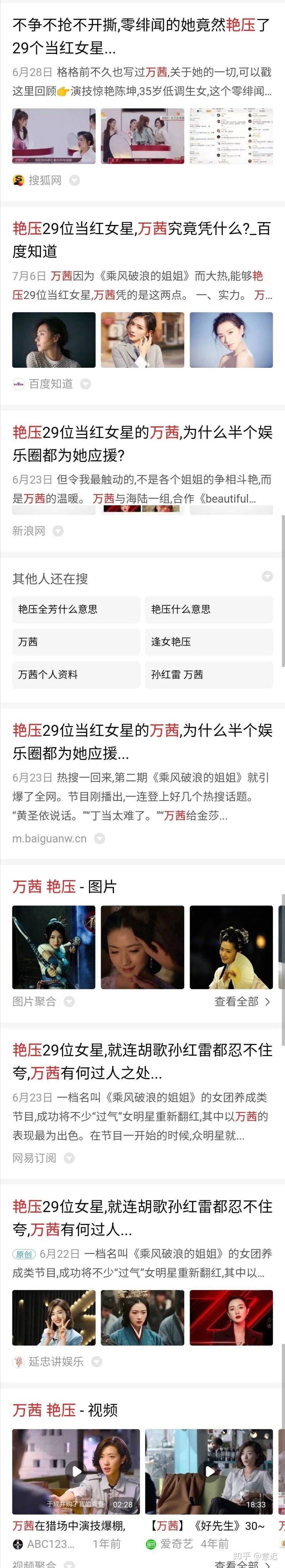 这样的存在,不止是在30个姐姐中特别,在整个演艺圈中,也不多见。 这样特别的姐姐,多半也是讨节目组工作人员喜欢的吧,所以,从这个角度来讲,节目组在后期剪辑上对她有偏爱,也是可以理解的。至于“籍贯说”,我认为是牵强的,我还没看过哪个机构决定捧一个人,主要考量因素是ta的籍贯。 通常,“力捧”的背后,有两个主要动因。利益,是最主要、也最常见的动因;还有就是情感驱动型,我由衷的欣赏你、喜欢你,又或者,你是我的什么人,和我之间有特别的情感关联。 当然,利益和情感,有时也是结合的,比如我力捧你,可能既是喜欢你、欣赏你,同时也是预测了你有巨大的潜能,很可能会红,最终会给“我”的力捧带来丰厚的收益。 芒果台对万茜的“力捧”——开篇是众星捧月般的出场造势,后续是“观众喜爱度”的霸榜排名以及镜头数——可能正是利益和情感的双项结合所致。 要凸显和维持住一个平台性机构在演艺圈生态中的巨大话语权和影响力,没有比造星能力更直观、更有效的了。首季“浪姐”捧红了万茜,可以想象,接下来会有多少30+女星挤破头想上这档节目。 同时,这也算是对节目立意的一种“兑现”——无惧年龄就要赢,30+浪姐一样可以乘风破浪。 万茜的爆红,与湖南台的“力捧”有强关联,与她本人在初舞台上表现出的个人魅力有关,也不得不说,和她经济团队的强势营销有关——然而,这也真是一把双刃剑。 在“浪姐”初期,网络上出现了铺天盖地赞美万茜的文章。这其中,有些是自媒体公号自发的赞美,但也有一部分是强势营销的结果,“通稿味”实在是太重。很多营销号上发的文案,甚至都是一水的。 并且,很有荒诞感的是,除了有主打“人淡如菊”的,也有“艳压”一路的。看不出这是自相矛盾的吗?也是迷之操作了。