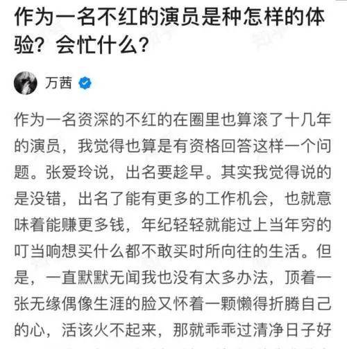 《柳如是》剧照 曾经“不红”,也是得到万茜本人盖戳认证的——她在知乎上曾专门回答过一个问题,“作为一名不红的演员是种怎样的感受?会忙什么?”