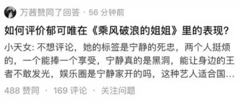 但在那部戏里,她没有给我留下太清晰的印象。 在知乎、微博逛一圈,发现很多人虽然对她的认知度比我是要好一些,但他们也纷纷表达着同一个困惑: “浪姐”之前基本没太注意到万茜,她目前为止还几乎没有一个具有高国民认知度的角色,也没出过什么“要害”话题被集体关注与讨论过,怎么到了“浪姐”观众喜爱度排行榜上,就基本就没跌出过“前三”,并且多次冲到了第一? 万茜是怎么就“爆红”起来了? 而与突如其来的“爆红”伴生的,是戏剧性的口碑逆转。 “浪姐”初期,网络上对她是一面倒的盛赞之声;而现在,“倒万”也成了一股极其强劲的风潮。 不信任不喜爱到什么程度呢?连车祸导致手臂骨折,都被质疑造假……还要本人亲自发视频和照片来自证。 而“成团夜”之后的“知乎点赞”事件,以及万茜随后的“盗号”解释,更将对她的恶评推上了顶峰。
