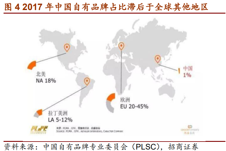 欧洲、美国连锁零售门店的自有品牌比例之所以高,第一大原因,是零售业集中度高,零售商对生产商具有规模优势,因此用更低价、但净利率更高的自有品牌来提高利润水平。