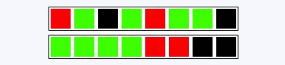 ▲如果用不同颜色代表不同歌手,这意味完全真随机时,上下两种列表都可能出现 不过,Spotify 一开始并不理解用户说的“不随机”是什么意思,但在研究之后发现,用户的核心理念是不希望一位歌手在短时间内重复出现,但这里其实用户陷入了了一个经典的“赌徒谬论”,当人们连续几次没有中彩票时,就会认为自己下次中奖的几率会增大,而其实每次概率都是独立而相同的。 但如果用户连续听到某一位歌手的作品时,他们就会粗暴地觉得这个算法“有问题”。 结论表示,用户并不喜欢“完美的随机”。 比起“完美”,用户更喜欢的是“平衡” 那什么是“不完美的随机”? 在马丁·菲德勒(Martin Fiedler)的博客文章《混洗音乐的艺术》中,他展示了为什么完全的随机列表是糟糕的。 假设在你的播放器中存在三种不同曲风的流派分别是 A、B、C,其中 A 有 10 首,B 和 C 都是 11 首,一共 32 首歌。如果使用真正的随机算法来洗牌会出现怎样的情况?可能是: