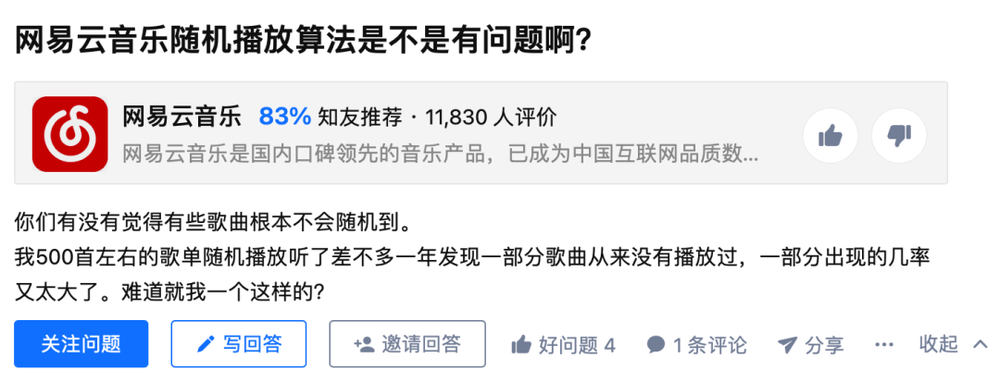其实 app 对于这个“随机列表”是有干预的,而并非简单的进行洗牌,而但从结果上说,到底用户感知是好还是差,就看各家对于“洗牌算法”的理解和设计了。尽管吐槽网易云算法的用户不少,但也并不影响推荐歌单和评论等功能受到欢迎。 根据知乎简介为 QQ 音乐产品经理的用户刘彦彬的回答,在洗牌算法之中也会掺杂更多的大数据算法干预: