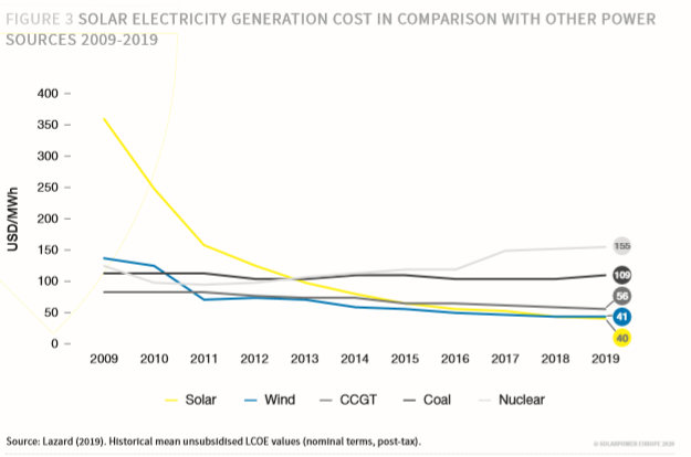 根据欧洲光伏产业协会最新的分能源度电成本数据,光伏发电的成本下降很快,从2009年35美分每度,一直到下降到2019年的4美分每度。