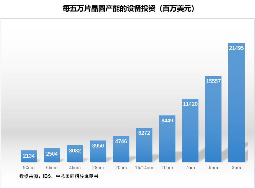 根据IBS的数据,一条年产5万片晶圆的28nm制程生产线,光设备投资就需要39.5亿美元,14nm制程需要62.72亿美元,至于更先进的7nm和5nm制程,起步就是一百亿美元。