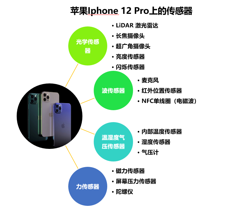 苹果在2007年发布第一部iPhone手机之后,就一直在不断的增加各类传感器的配置,完善相关物联网设施,到目前为止,至少有4大类14个传感器。最新的iPhone 12增加了激光雷达,为将来的VR应用打下基础。