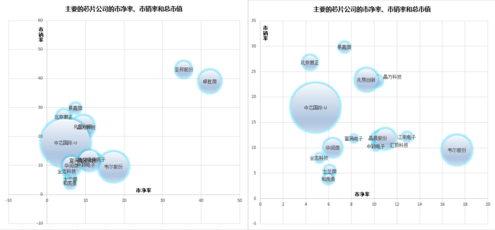 上图是这17家芯片公司的市净率、市销率和总市值,左边图是全图,右边图是放大后的局部。圣邦股份和卓胜微,属于市净率和市销率双高,都在40倍左右,远远高于其他芯片公司。