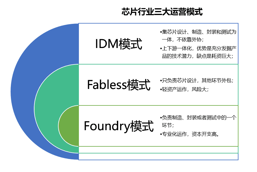 从运营模式看,芯片行业可分为IDM、Fabless和Foundry三种模式:IDM就是什么都干,从设计制造一直到封装测试;Fabless就是只做设计;Foundry则是只做一块,制造、封装或者测试选择一个环节进行专业化。