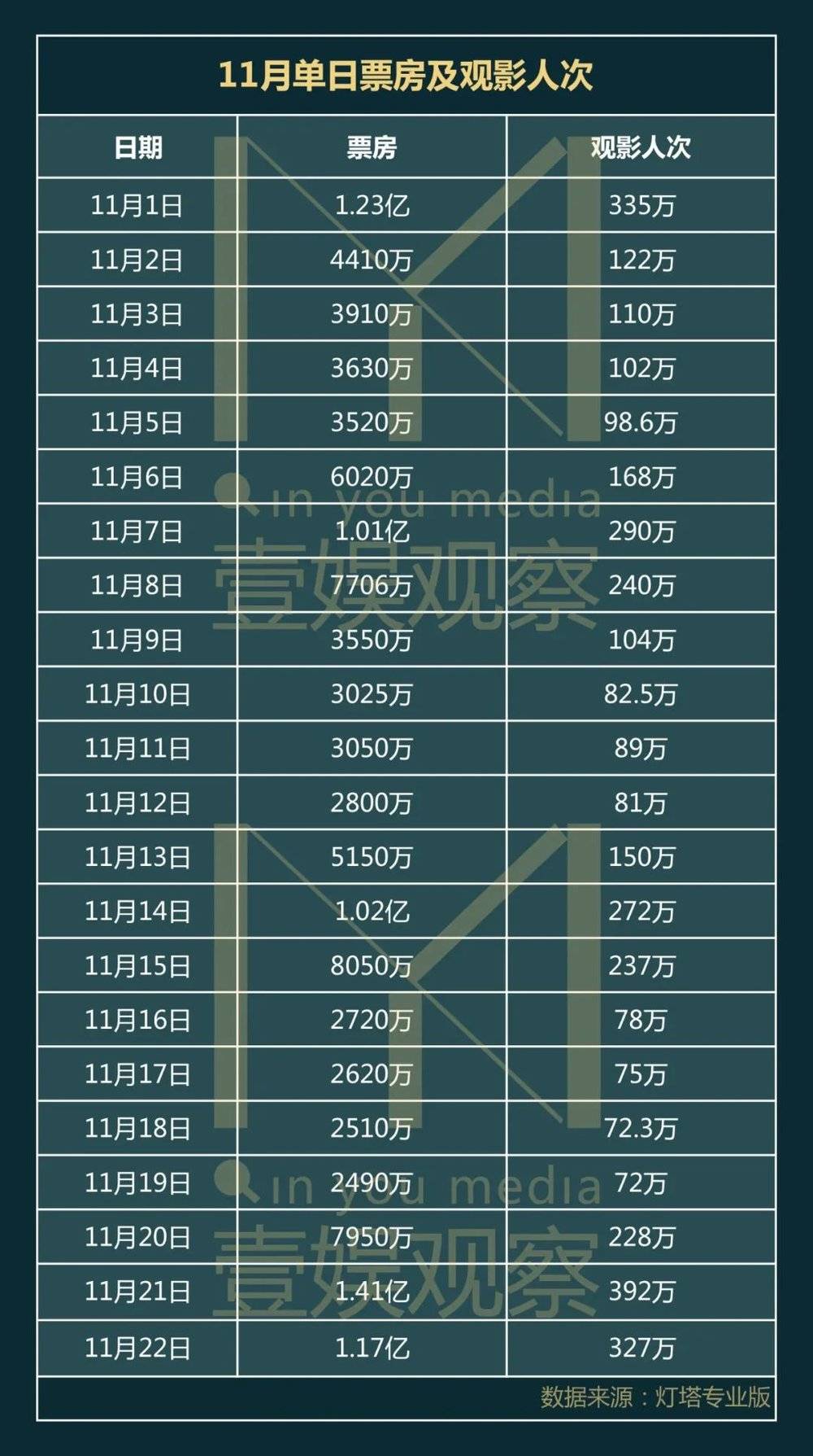 作者:杜威,头图来自:视觉中国 2773万、2654万、2505万、2483万......上周一至周四(11月16日至19日),工作日“接连倒车”的票房数字刺激着业界神经,四天累计仅1.04亿元票房,创下自《八佰》上映后最冷工作日时段。虽然周五新片《除暴》力挽狂澜,三天拿下2亿元,让周票房再突破4亿大关,但依然难阻11月整体颓势。 11月23日,中国影院复工行进至第一百二十七天,全年票房突破159.72亿元,朝向200亿目标奋力前进。截至22日,11月仅收获13.26亿元票房,距离去年11月的35.96亿有着超过20亿元票房差距,甚至与2014年11月还相差11亿元,近七年最冷的11月即将诞生。 如果本周新片《一秒钟》《疯狂原始人2》再无亮眼成绩(单周5亿元票房以上),11月票房则难以突破20亿元,到时候今年11月也将成为2015年以来最低单月票房(自2015年1月起,停工期不算,未有单月票房低于20亿)。
