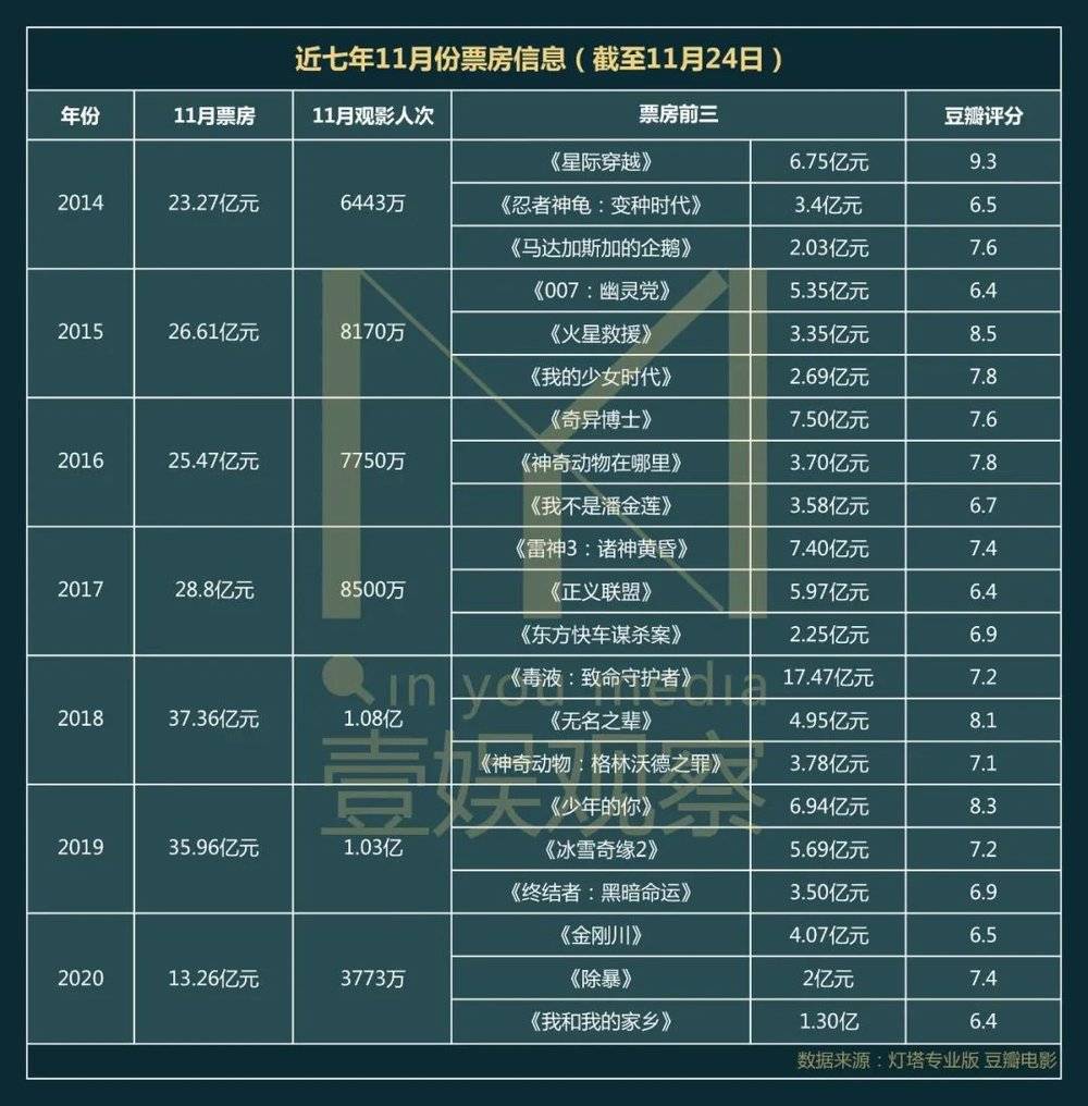 《一秒钟》剧照 进入11月之后,尤其是近两周表现,惨淡之状与7月份刚复工水平靠近(上周工作日票房不敌7月复工周末票房)。可目前全国影院复工数量和营业成本早已经是当时的几倍。整个11月,全国影院又到了勒“死”裤腰带过日子的情况,大部分影院的营运机制也发生了相应变化。 “我了解到影城单日票房几千、几百、挂零的都有,你能想到的、想不到的(惨淡)情况都有,这就是11月全国(影院)的状态。”上海某影城经理向壹娱观察介绍。 传统意义上“冷档期”的11月,在无好莱坞大片暖市、无国产大片坐镇、无经典复映片暖市以及“黑马之姿”影片无口碑等情况频发的今年,显得尤为寒冷。今年入冬后还存有的疫情复发的可能性,也让业界蒙上一层阴影。 “不过,现在心态已经和刚复工时不一样了,处理经验也比较充足了,还有十天左右,咬咬牙再熬过去呗。”该经理继续表示,影院复工四个月前后,影院人对待冷门档期上的心态已经发生了变化,并且对近在咫尺的12月充满信心。 七年来最冷的11月 11月本就是传统冷门档期,与每年的4月、9月份一起同时处于票房末流,如2019年全年11月排在第10、2018年排在第9、2017年排在第12。在该档期前后,国产大片基本分兵10月国庆档、12月贺岁档以及来年春节档,所以整个11月只能由好莱坞大片和腰部国产片撑起大盘。 壹娱观察整理了近七年来的11月份票房成绩。2014至2017年,11月份整体票仓全部由好莱坞大片撑起,仅有个别国产片入榜月票房前三。整月票房在23到28亿元之间徘徊。